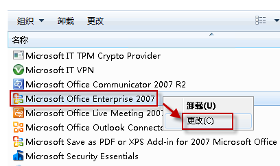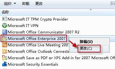 4.右击 Microsoft Office 2007/2010,选择“更改”。(对于 Microsoft Office 2003 的操作与此类似)