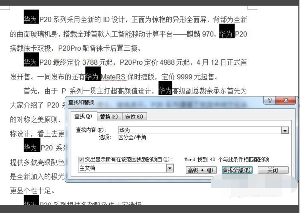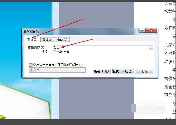 3、出现“查找和替换”对话框。选择“查找”选项卡,在“查找内容”输入框中输入“华为”。