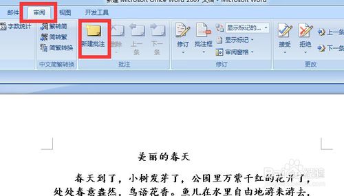 首先打开一篇没有批注的文档,想在哪里添加批注,就把光标放在哪里。例如我想给题目添加批注,先把光标放在题目的后面,接下来在上方的菜单栏中选择审阅后,点击新建批注。