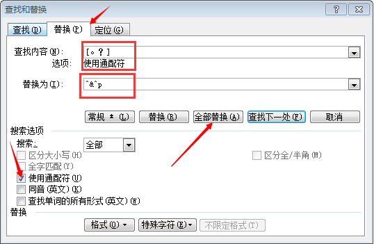2、查找内容框格内输入“[。?]”;替换为框格内输入“^&^p”,勾选“使用通配符”。点击“全部替换”即可。