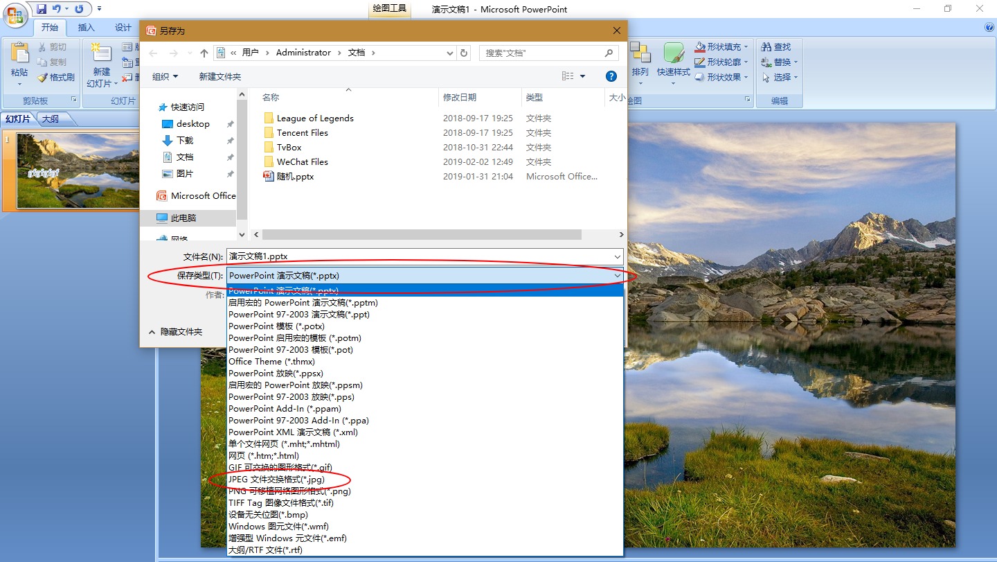 6、在弹出的保存对话框中,输入要保存的名字,单击保存类型下拉菜单,选择JPEG格式,点击保存即可。