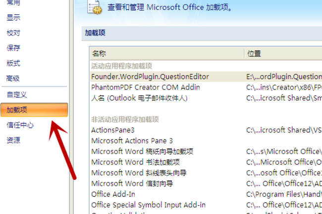 三、然后,在对话框中左侧菜单选择“加载项”,点击打开。