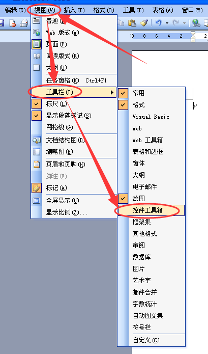 1、打开Word,点击【视图】菜单下的【工具栏】—【控件工具箱】。