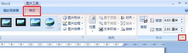 3、点击“格式”选项卡,在菜单栏最右侧“大小”区域的右下角,点击启动器,如图所示。