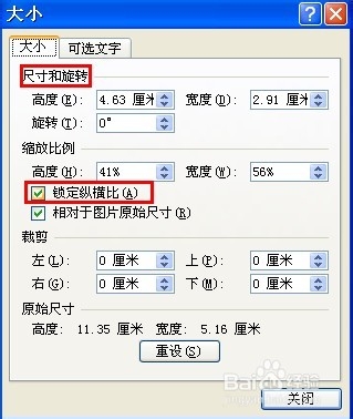 4、在弹出来的“大小”对话框中,勾选“锁定纵横比”,然后在“尺度和旋转”区域输入想要设置的高度和宽度值,单击“关闭”完成设置。