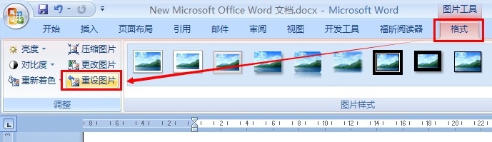 6、对图片进行各种编辑后,如果对设置不满意,可以在“格式”选项卡的“调整”区域点击“重设图片”按钮,将图片恢复至最初的状态,以便重新编辑。