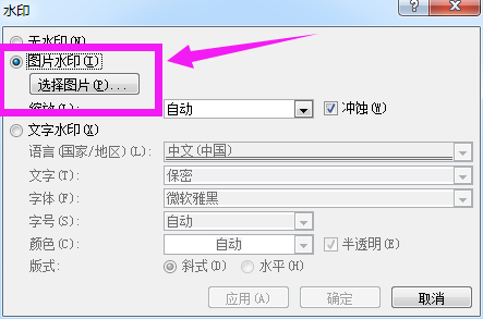 6、在弹出的水印对话框中可以看到需要设置的选项,如图所示:
