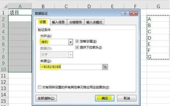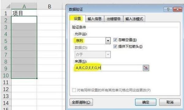 4、在“设置”中,允许选择“序列”,来源输入下拉菜单的内容,以英文逗号分隔,或者直接选择下拉菜单内容所在单元格;