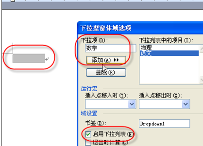 3.双击下拉型窗体,在“下拉型窗体域选项”窗口中,在“下拉项中输入“内容”后再点击“添加”按钮完成下拉列表。最后在下方勾选“启用下拉列表”
