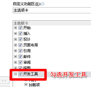2.进入word选项后,点击自定义功能区——》开发工具,勾选上,点击确定,如图。