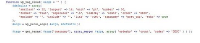 ‘smallest’ => 8, ‘largest’ => 22, ‘unit’ => ‘pt’, ‘number’ => 45,‘format’ => ‘flat’, ‘separator’ => “\n”, ‘orderby’ => ‘name’, ‘order’ => ‘ASC’,