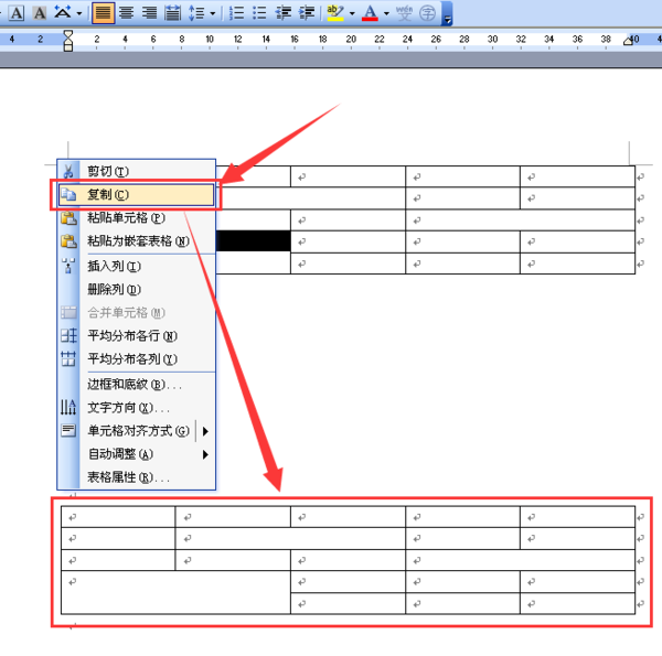 复制表格的方法很简单,Word表格制作好了之后,将鼠标移动到表格的左上方,当出现双向十字箭头的时候,在它上面点击鼠标右键,在右键菜单中选择“复制”,然后再在他处(需要的地方)单击鼠标右键,点“粘贴”即可。