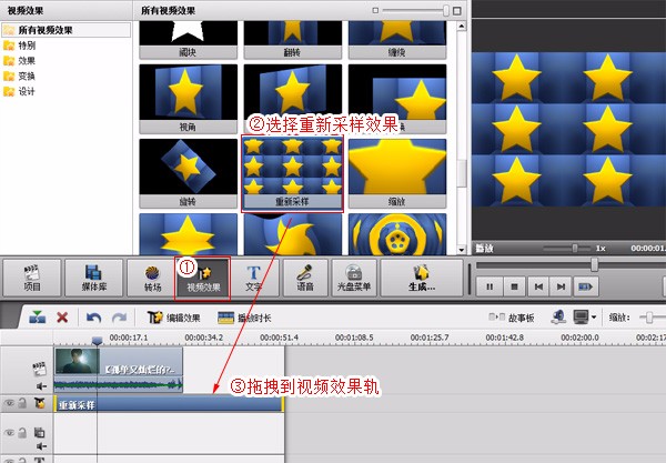 从软件中间的功能栏里找到“视频效果”并点击进入,从里面多种特效中找到“重新采样”这个效果,点击这个效果右边的预览框里就会显示该特效的效果,并按住重新采样特效往时间线面板里的视频效果轨里拖动,视频效果轨就在视频轨下面。