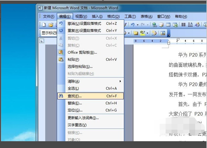 2、点击“编辑”菜单,选择“查找”。