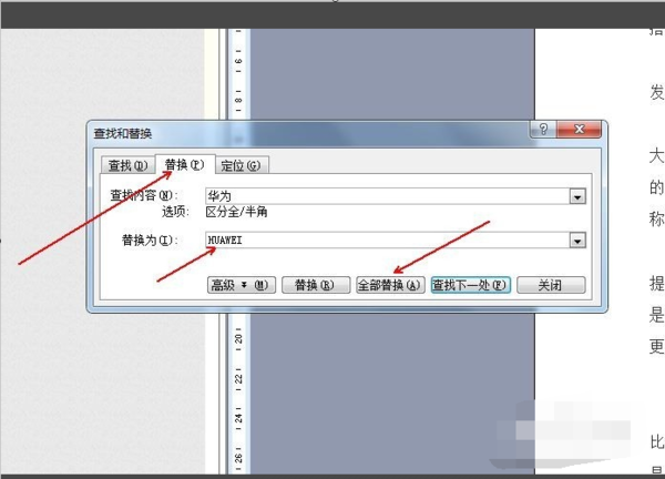 6、点击“替换”选项卡,在“替换为”输入框中输入“HUAWEI”,点击”全部替换“。
