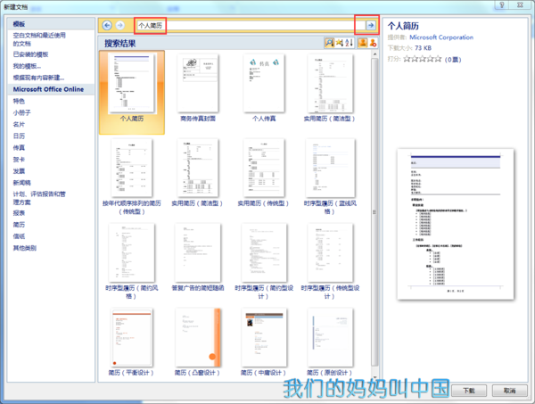 用在线现成的模板制作:按OFFICE图标,“新建”,如图操作,在搜索栏输入“个人简历”,然后搜索: