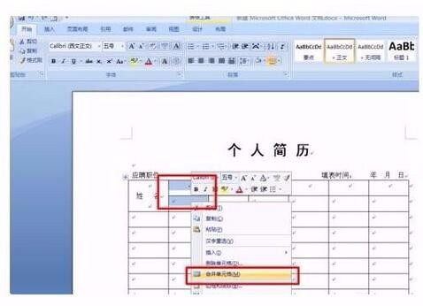 7、选中想要合并的两个格子,在阴影部分右键单击鼠标,选择合并单元格。如下图(七)
