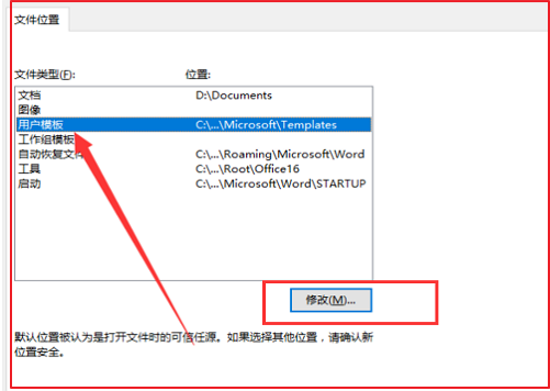 4、进入到文件位置设置以后,我们选择用户模板并且点击【修改】。