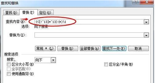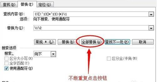 3、然后点击【替换为】文本框,输入"\1\2" ,单击勾选下面【使用通配符】前的复选框打勾,如果找不到这个复选框,就是出于简略窗口模式,可以点击窗口下方的【高级】按钮打开。