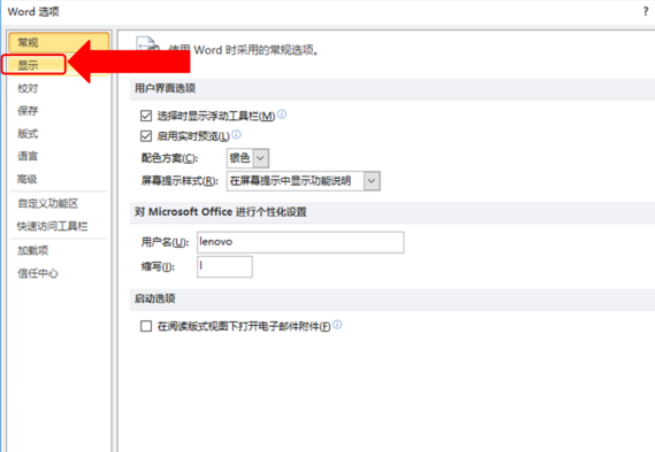 3、这是也会出现Word的选项页面,在第二个选项中找到“显示”,点击一下。