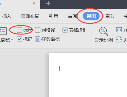 2、点击工具栏中的“视图”,找到“标尺”选项,将“标尺”前面的勾选框选中。