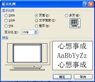 2、弹出显示比例对话框,选中页宽选项,在百分比处调整百分比即可控制页面显示的宽度,如图所示。