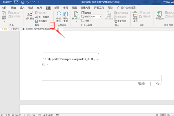 1、打开文档,在“引用”,找到脚注一栏右下角的箭头。
