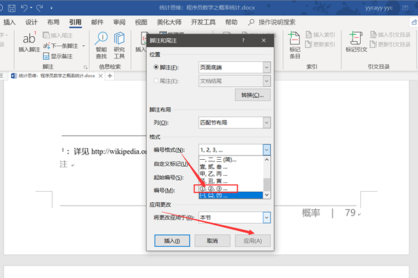 这里选择“每页重新编号”(用的最多的),最后点击“应用”设置完毕,此时每一页重新进行编号成带圈的脚注了。