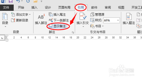2、设置显示备注:引用--脚注--显示备注,这时窗口下方出现“尾注”窗口