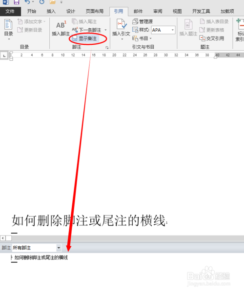 点击菜单 引用-脚注中的显示备注 命令,打开底部窗口。
