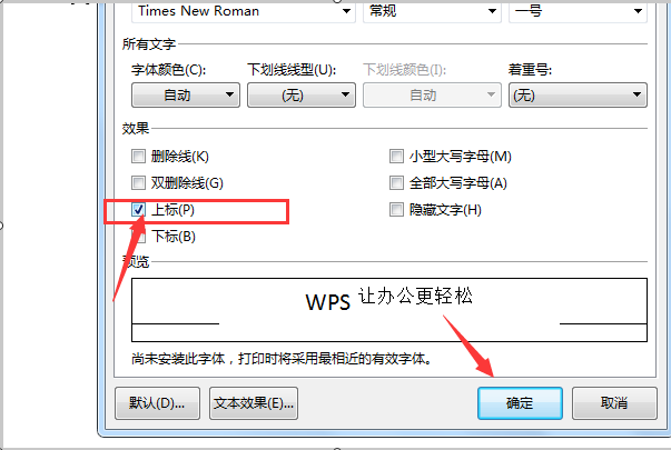 5、在进入字体设置界面后,将该页面中上标前面方框勾选上并点击确定选项确定将选中部分设置为上标。这样就完成了上标设置。