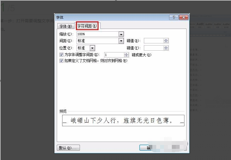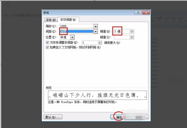 4、将字符设置为加宽,磅值为1磅,单击“确定”按钮。