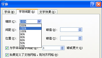 3、弹出字体对话框,选择字符间距选项卡,在缩放处选择150%即可,如图所示。