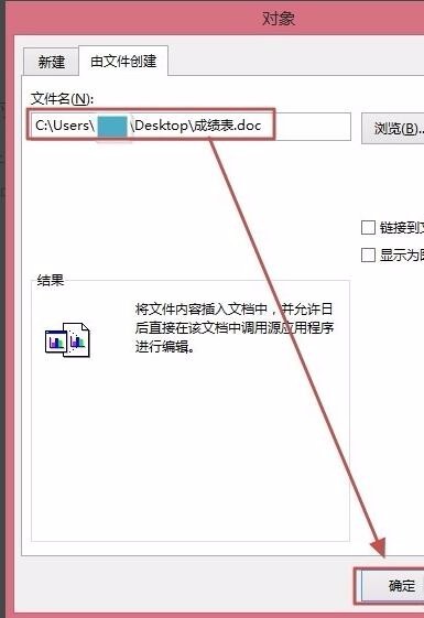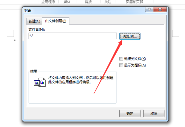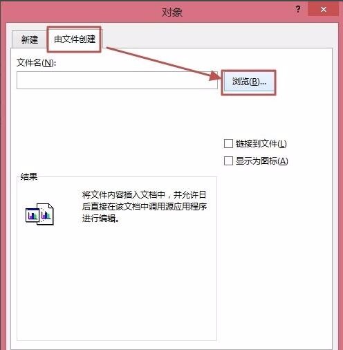 这时候会打开“对象”对话框,在“由文件创建”选项卡,单击“浏览”。