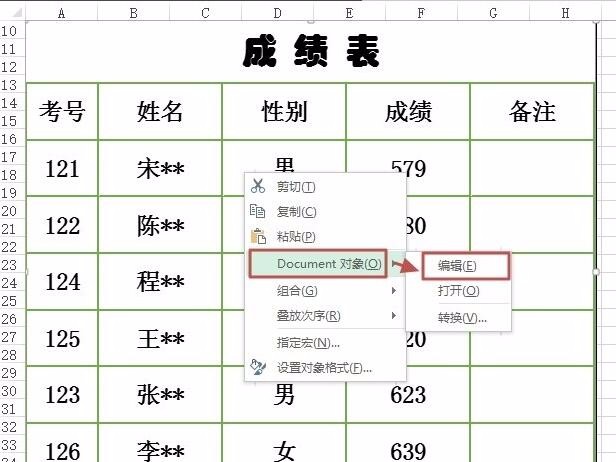 若需对数据进行编辑可以这样操作:在对象上单击鼠标右键,然后在快捷菜单中依次选择“Document对象”—“编辑”。(注意:在对象上双击即可)