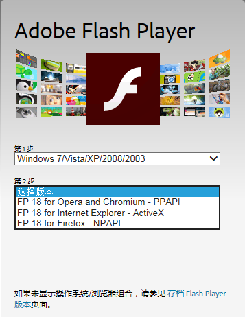 2、进入是官方网站,选择电脑操作系统版本,以及Flash插件适用的软件。
