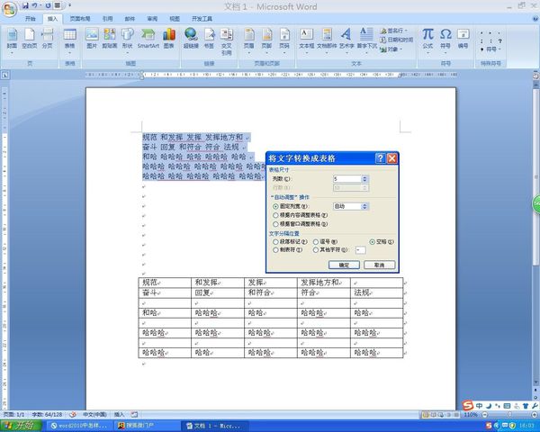 可能方法不对。参照Word2007中的方法:编辑word文档时把要放入不同单元格的文字用空格隔开,排列好填入表格的各行内容,选中文字——插入——表格——文本转换成表格——弹出“将文字转换成表格”——修改列数——确定即可。