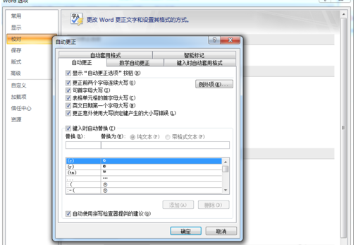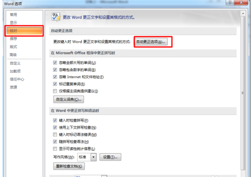 5.点击"自动更正选项",点击打开自动更正选项对话框