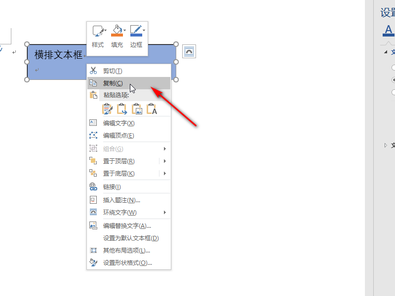 1、在word文档中点击”文本框“单击鼠标右键在弹出的下拉菜单中选择”设置形状格式“;
