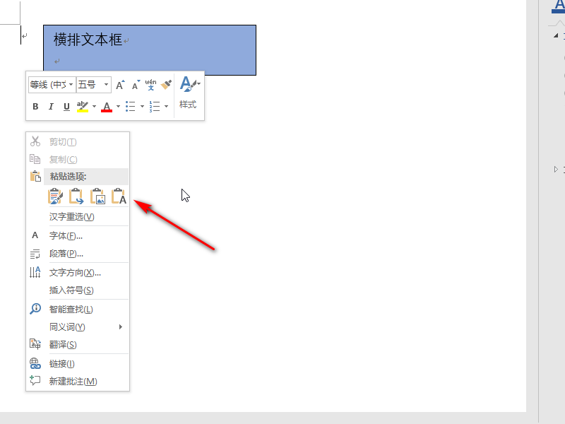 4、然后在空白位置单击鼠标,使光标移动到指定位置,然后鼠标单击右键,在弹出的菜单列表中选择仅保留文字粘贴。