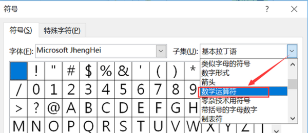 打开“子集”的下拉框后,滑动滚轮或拖动下拉框右方的滑动条找到“数学运算符”,点击“数学运算符”,跳转到数学运算符区域。