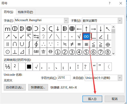 打开数学运算符区域后,单击选中所想使用的数学运算符,并点击“插入”按钮即可插入该数学符号,如图以无穷大“∞”为例。