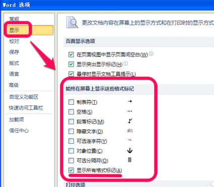 3、进入word选项里之后,点击显示,会看到一栏专门对显示格式标记的勾选项,外面的开关是控制最下面一个选项的“显示所有格式标记”,一般情况下,全选择就会显示所有的标记符号。