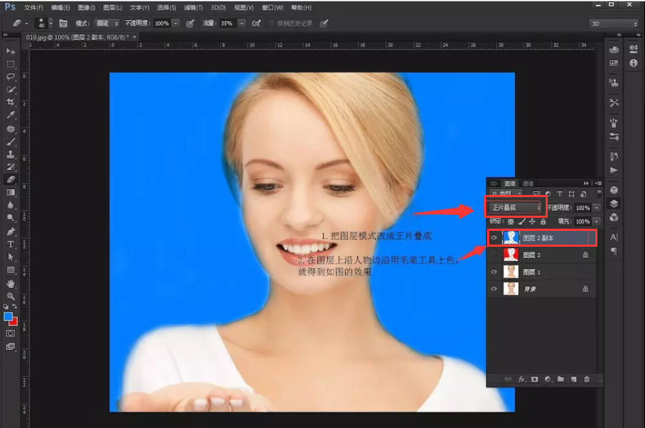 五、选择画笔工具,把前景色调成你要的背景色。然后在新建的图层上面看上你要的背景色,人物边沿时尽量不要弄到人像上,如画到人像上可用橡皮工具擦拭多余的部分。