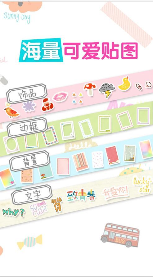 滤镜:支持20多种多种滤镜,支持对比度,亮度,增加文字和小贴纸等等