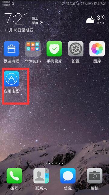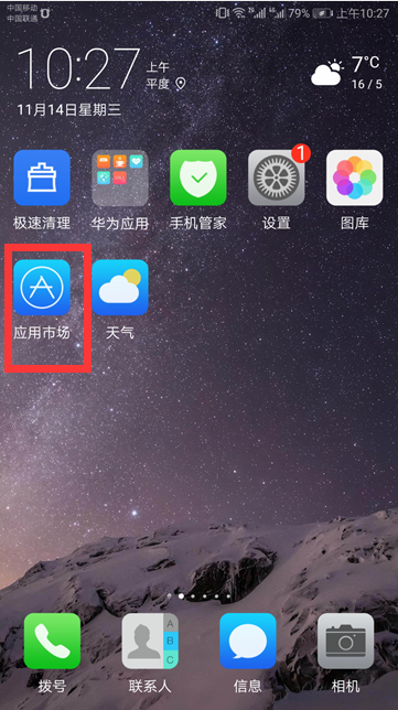 1、打开手机界面,找到“应用市场”