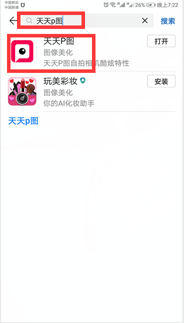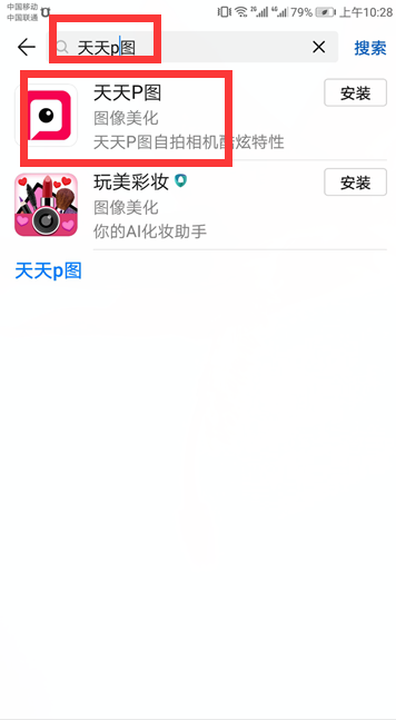 2、在应用市场的搜索栏中输入“天天p图”,单击搜索一下,出来的软件进行下载并且安装