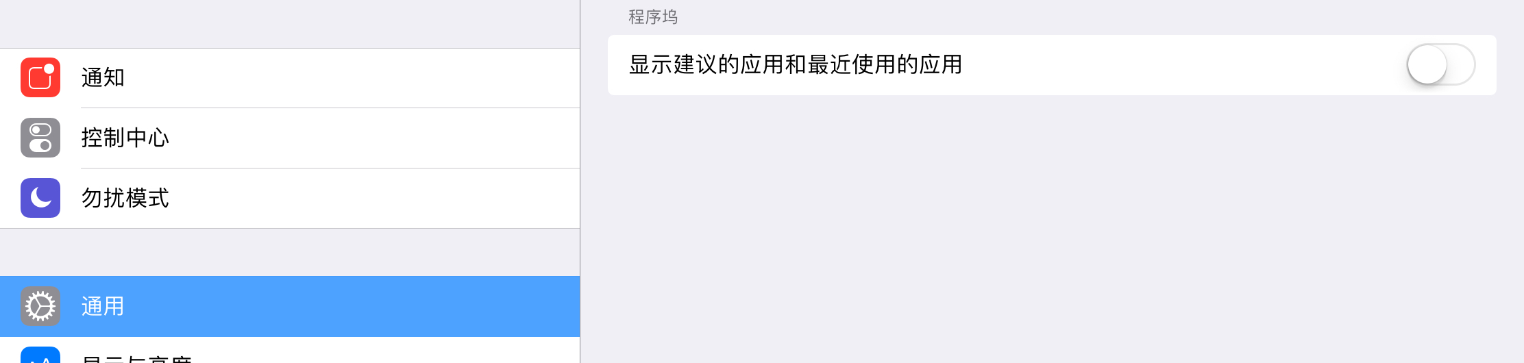 设置-通用-多任务与Dock(多任务与程序坞),关闭「显示建议的应用和最近使用的应用」。