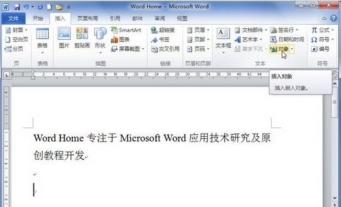打开Word2010文档窗口,将插入条光标定位到准备插入对象的位置。切换到“插入”功能区,在“文本”分组中单击“对象”按钮,如图所示。