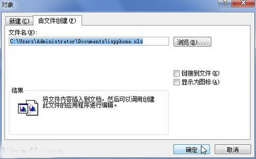 第2步,打开“对象”对话框,切换到“由文件创建”选项卡。单击“浏览”按钮查找并选中需要插入到Word2010文档中的文件,然后选中“链接到文件”复选框,并单击“确定”按钮,。